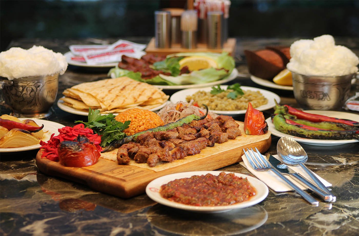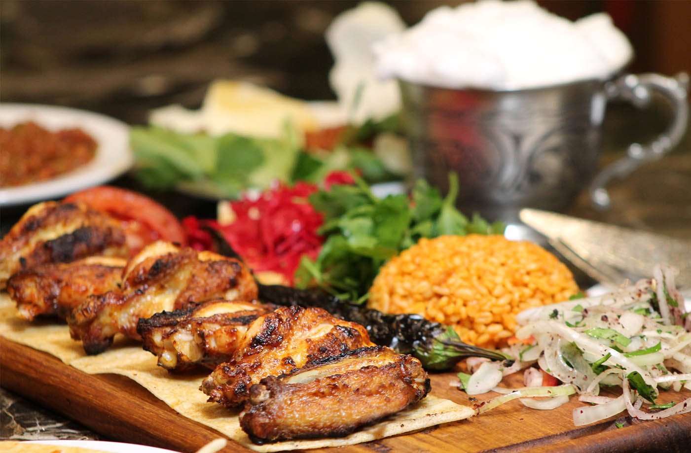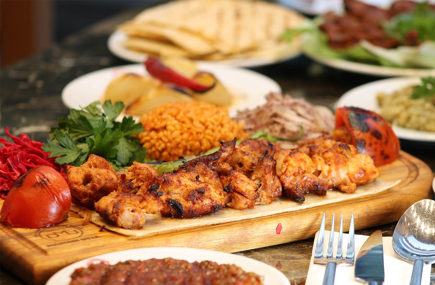 2 tike et şiş, 1 kalem kuzu pirzola, 2 tike tavuk, 2 tike kanat, 1/2 domates kebap, patlıcan süğürme, garnitürü