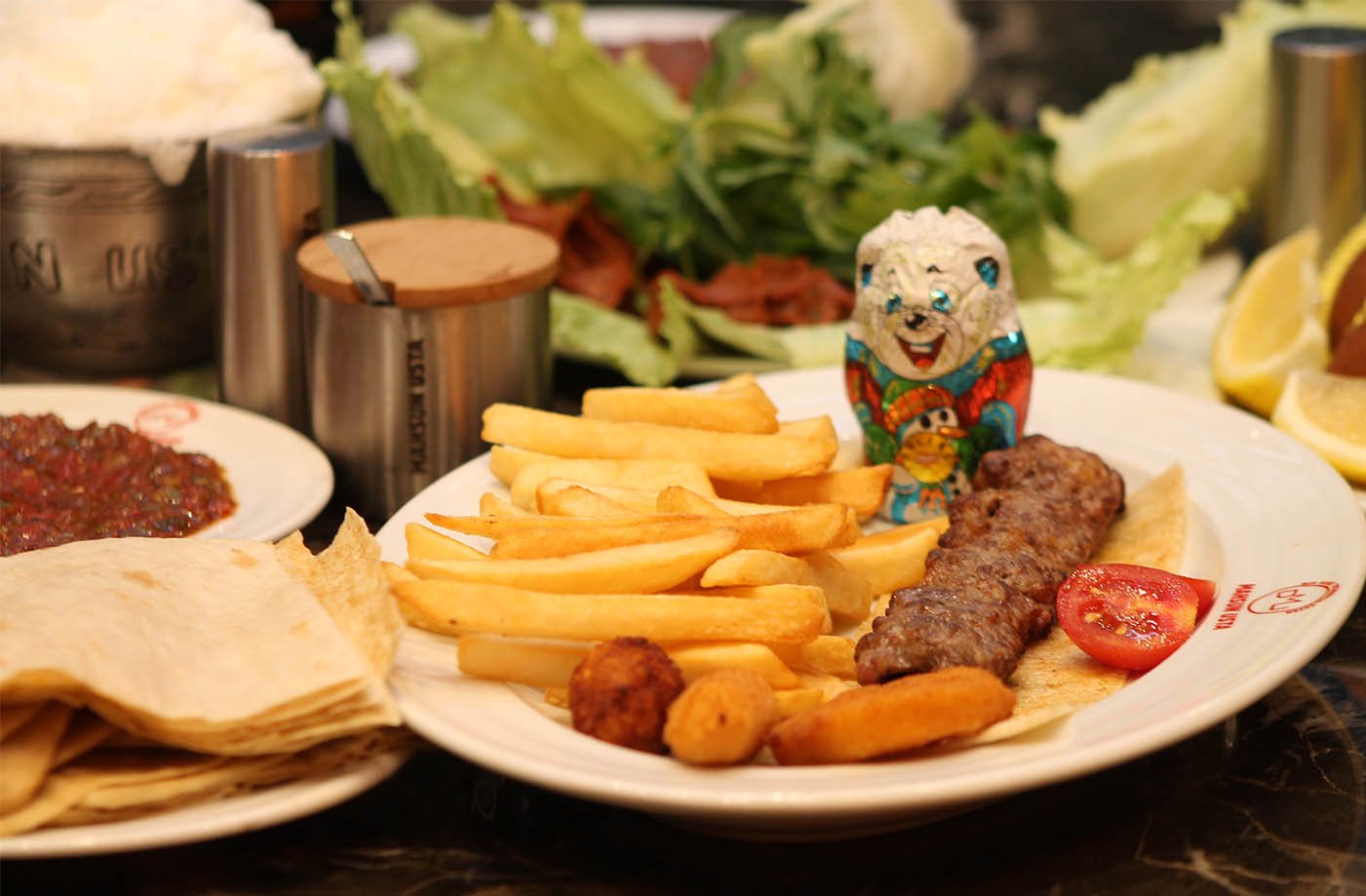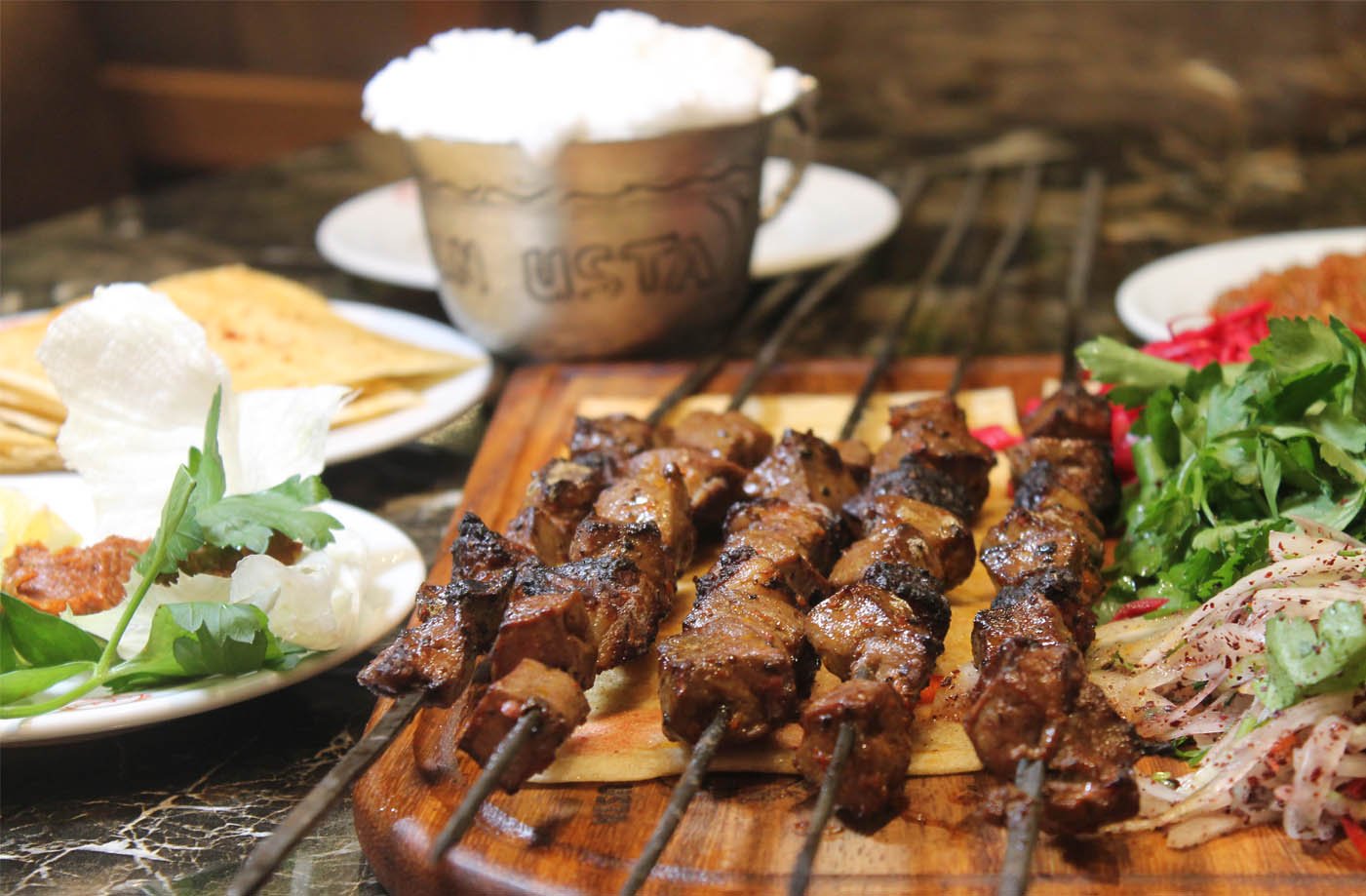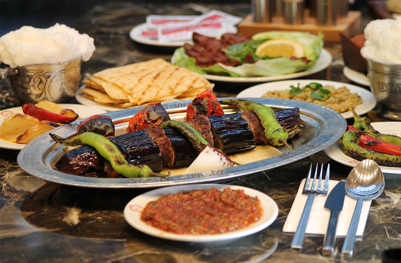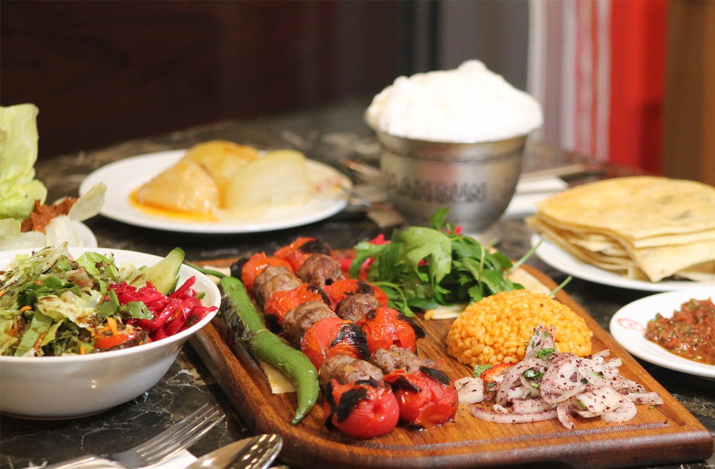 2 tike et şiş, 1 kalem kuzu pirzola, 2 tike tavuk, 2 tike kanat, 1/2 domates kebap, patlıcan süğürme, garnitürü