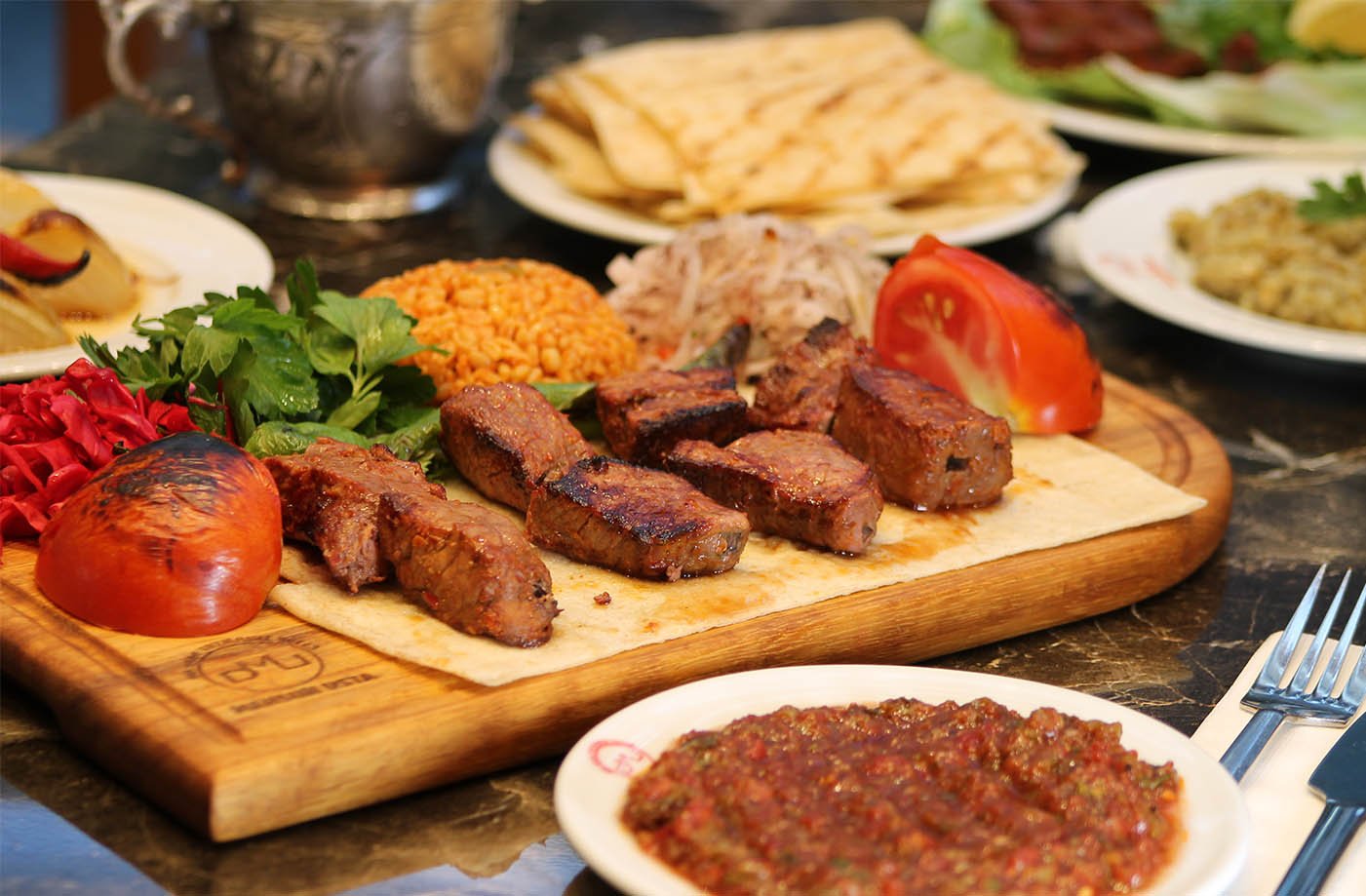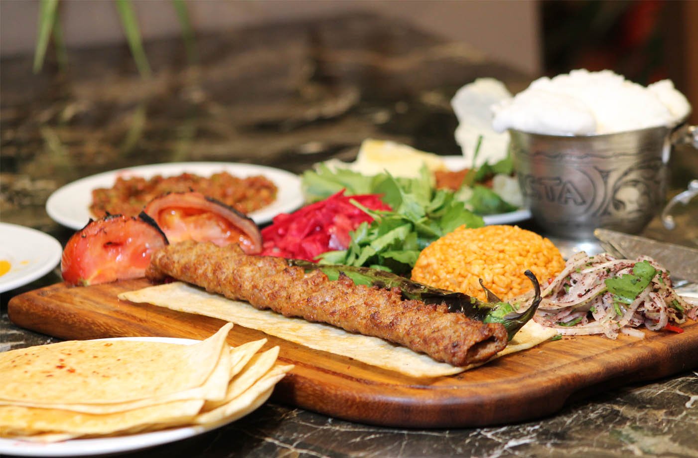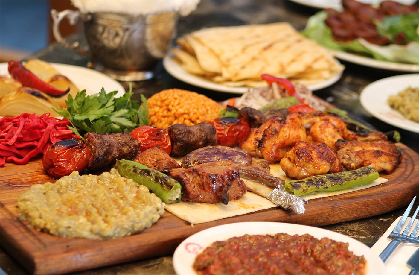 2 tike et şiş, 1 kalem kuzu pirzola, 2 tike tavuk, 2 tike kanat, 1/2 domates kebap, patlıcan süğürme, garnitürü